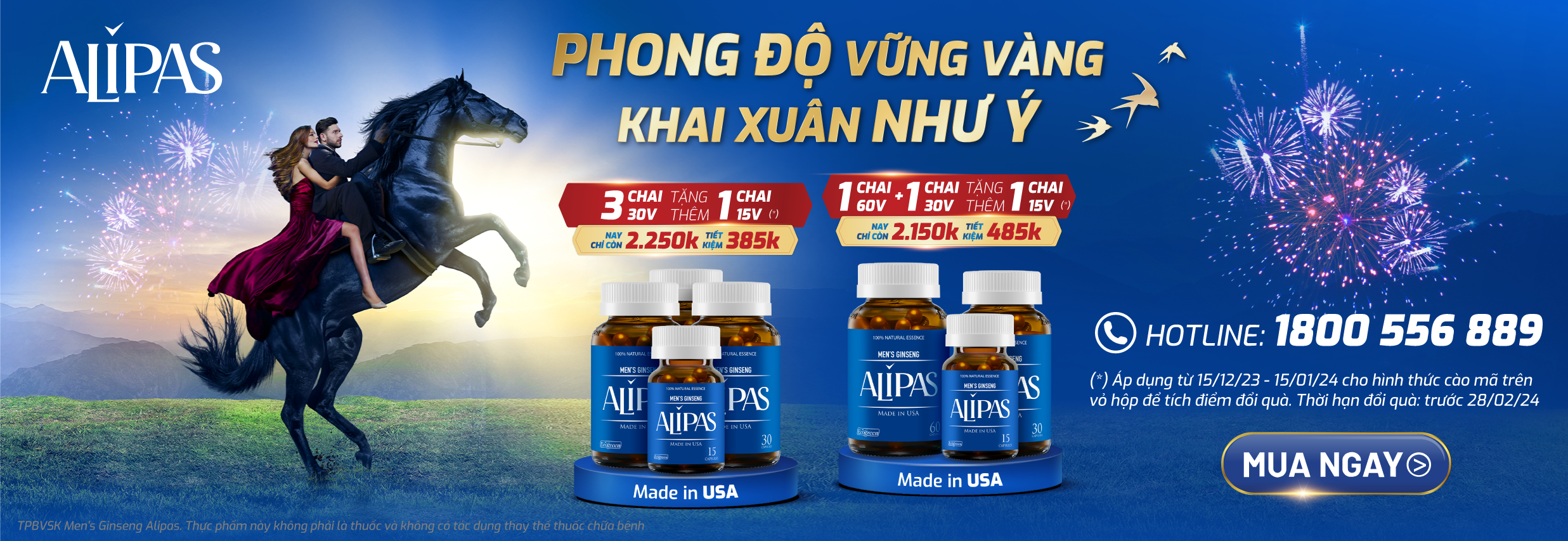Thực phẩm bảo vệ sức khỏe Men’s Ginseng Alipas (sau đây gọi tắt là “ALIPAS”) mang đến cho người tiêu dùng giải pháp tốt trong việc chăm sóc sức khỏe thông qua chương trình “PHONG ĐỘ VỮNG VÀNG, KHAI XUÂN NHƯ Ý” (sau đây gọi tắt là “Chương trình”).